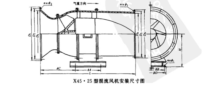 x45.25型斜流風(fēng)機外形及安裝尺寸